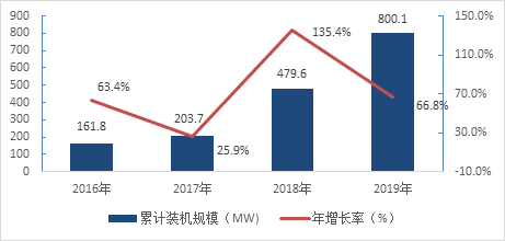 圖1:中國已投運(yùn)光儲項(xiàng)目的累計(jì)裝機(jī)規(guī)模(2016-2019年)