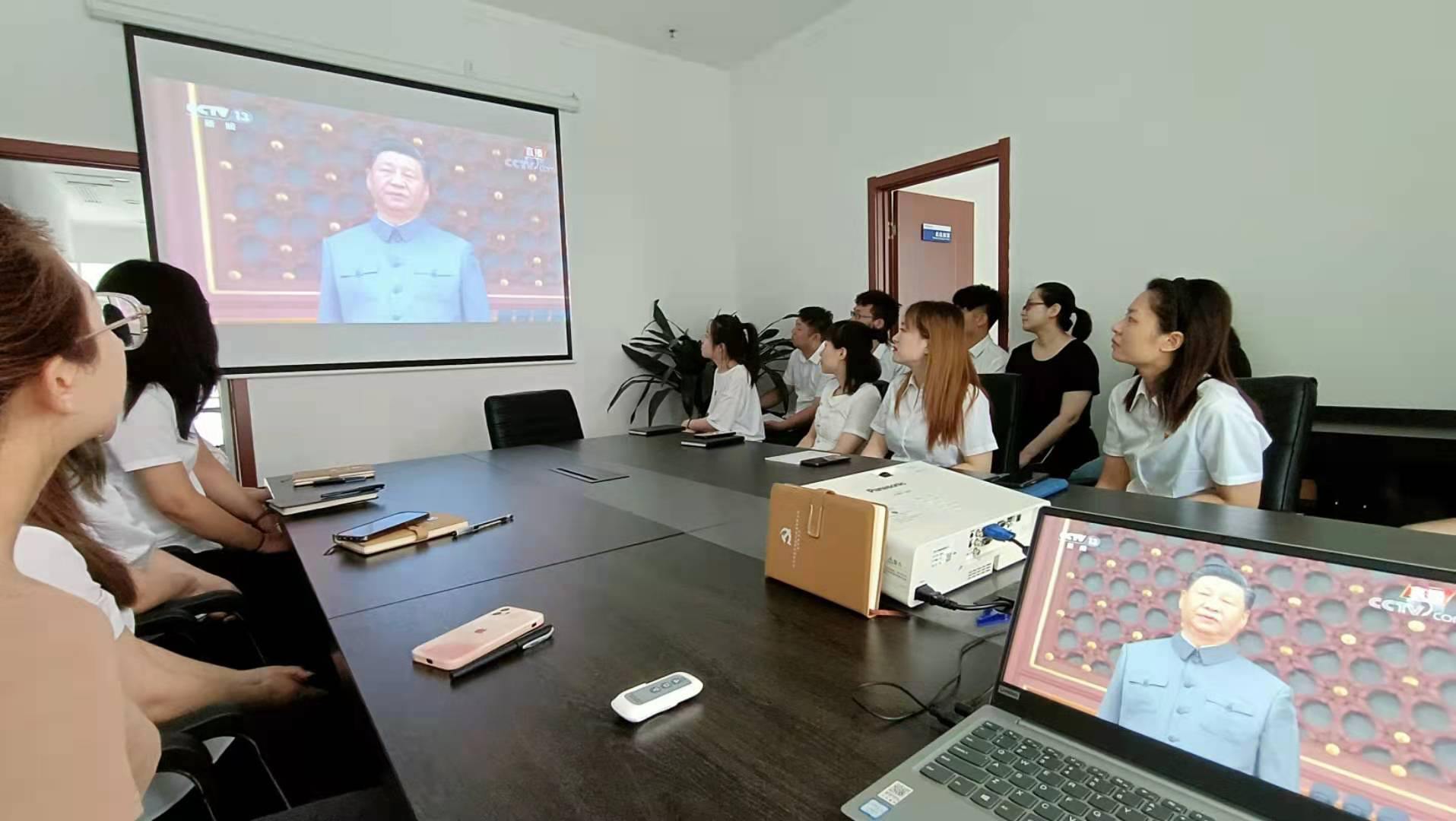 通過大屏幕,看到習(xí)近平同黨和國(guó)家領(lǐng)導(dǎo)人登上天安門城樓主席臺(tái),看到天安門廣場(chǎng)人頭攢動(dòng)時(shí),大家目不轉(zhuǎn)睛、聚精會(huì)神、認(rèn)真收看。電視直播期間,認(rèn)真聆聽習(xí)近平總書記的重要講話,邊看邊記筆記,總書記振奮人心的講話,會(huì)議室不時(shí)響起掌聲。一小時(shí)四十分鐘的直播,大家始終沉浸在熱烈莊重、恢宏磅礴的慶祝氛圍之中。大家紛紛認(rèn)為,百年恰是風(fēng)華正茂,未來(lái)仍需風(fēng)